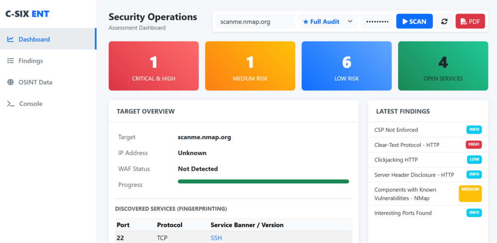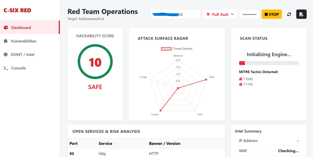 “Pusat Komando Keamanan.” Ini adalah jantung dari sistem pertahanan C-SIX. Sebagai aplikasi inti (Backend Core), modul ini berfungsi mengelola manajemen kerentanan (Vulnerability Management) secara terpusat. Ia mengorkestrasi seluruh data keamanan dan memastikan setiap celah di sistem Anda terdata dan terkelola dengan standar keamanan tertinggi.