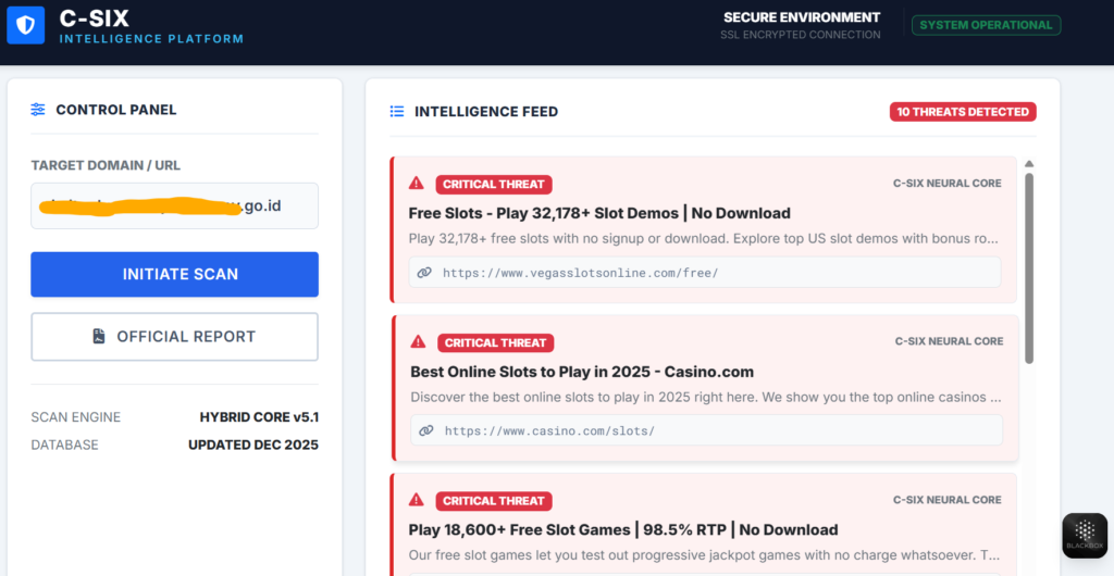 “Patroli Siber Otomatis 24/7.” Jangan biarkan jaringan Anda disusupi oleh aktivitas ilegal. Mesin pemburu ini bekerja secara otonom menyisir infrastruktur Anda untuk mendeteksi pola spamming, injeksi konten terlarang (seperti Judi Online), dan anomali trafik. Ia bekerja senyap di latar belakang, mengidentifikasi ancaman sebelum menjadi masalah besar.