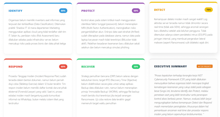 Visualisasi tingkat kematangan keamanan siber berdasarkan standar NIST & ISO 27001.